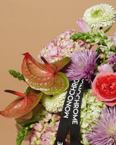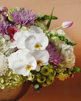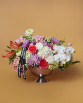 An elegant all-around vase arrangement presented in a sleek silver bowl, designed in Monochrome’s signature modern style. It features a refined mix of textured seasonal blooms, artfully arranged to create depth, movement, and balance from every angle. The metallic vase adds a contemporary touch, making it a statement piece for any space or occasion.