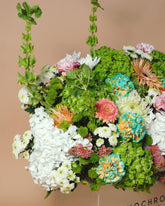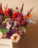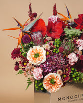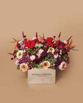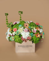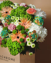 A garden-style arrangement presented in our signature silver Monochrome Flower Studio box. Designed with a lush mix of premium seasonal blooms, this elongated composition blends structured florals with delicate, airy elements for a harmonious balance. Cascading textures and organic movement evoke the beauty of a flourishing garden, making this arrangement perfect for upscale events, statement décor, or luxury gifting. A true embodiment of elegance and sophistication.